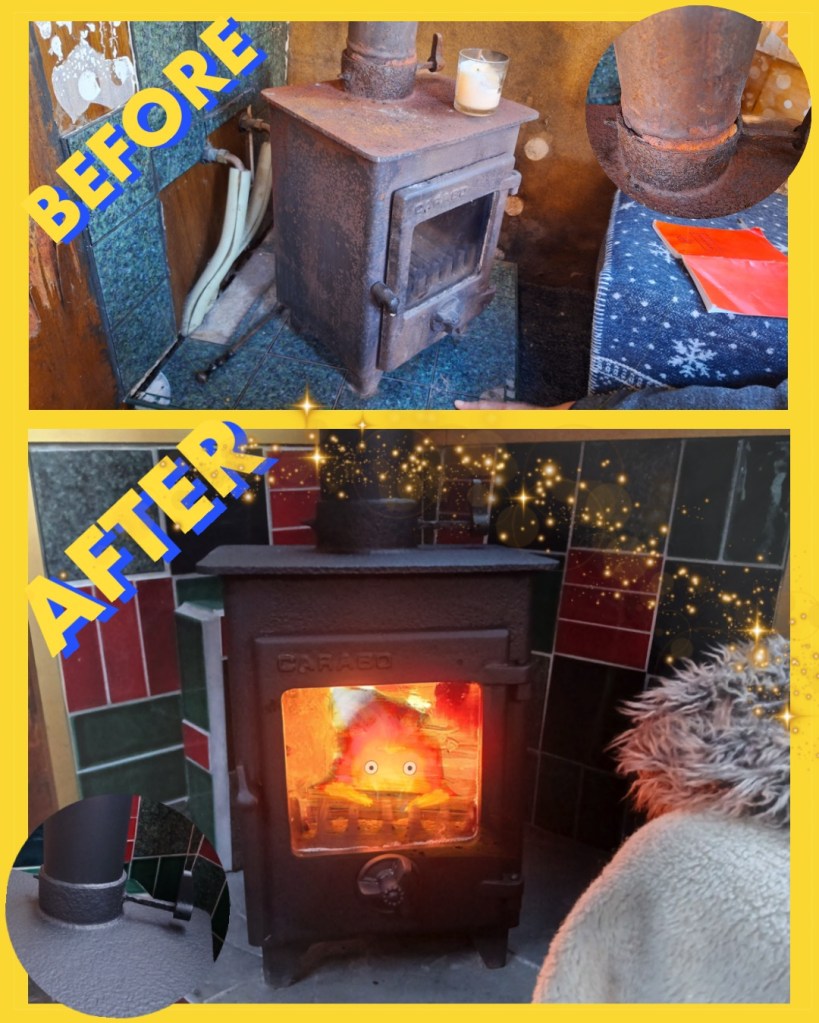 – A new flu was sourced, cut to size and fitted into the completely refurbished and painted stove.